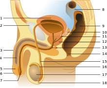 1. Urinary Bladder; 2. Pubic Bone; 3. Penis; 4. Corpus cavernosum penis; 5. Glans penis; 6. Foreskin; 7. Urethral opening; 8. Sigmoid; 9. Rectum; 10. Seminal vesicles; 11. Ductus deferens; 12. Prostate gland; 13. Bulbourethral gland; 14. Anus; 15. Ductus deferens; 16. Epididymis; 17. Testicles; 18. Scrotum